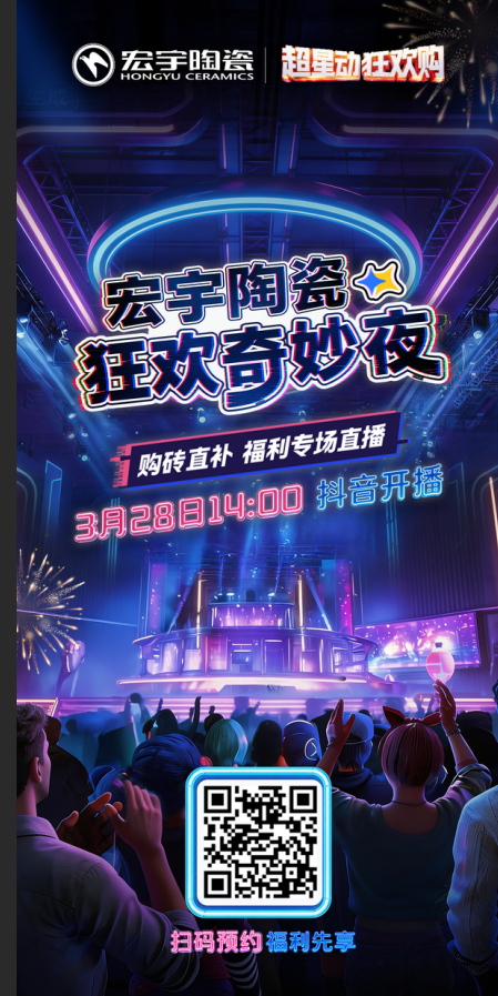 3月28日14:00,宏宇陶瓷"超星动·狂欢奇妙夜"抖音直播即将高燃开播。 本次直播内容看点十足:星动福利官~活力女团与星动男团热舞燃场,抖音达人@销冠李老板化身福利官惊喜现身,魔术互动解锁趣味福利玩法。